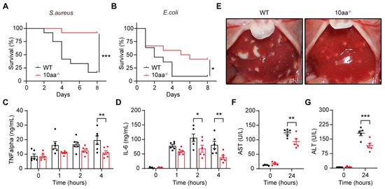 The whole blood, anti-coagulated with EDTA, was collected from the post-glomus venous plexus of WT and 10aa−/− mice (6~8-week-old) i.v. injected with S. aureus at different points of time (0 h, 1 h, 2 h, and 4 h for IL-6 and TNFα measurements; 0 h and 24 h for aspartate aminotransferase and alanine aminotransferase measurements) and centrifugated at 1000× g for 30 min. The levels of IL-6 and TNFα were performed according to the manufacturer’s protocol. Briefly, 20 μL of plasma per sample was mixed with 80 μL of reaction buffer, and incubated at 100–300 rpm for 1.5 h at RT. We then washed the plate and added HRP to incubate for 30 min. The activity was determined by an ELISA reader at an absorbance of 450 nm.