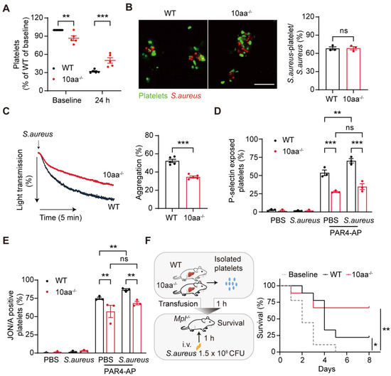 For detecting platelets and bacteria interaction in vivo, the PH-red-labeled S. aureus (1.5 × 108 CFU) were injected into WT and 10aa−/− mice and blood was collected through the post-glomus venous plexus at 30 s. The blood was then fixed in 4% PFA and subsequently blocked in 5% BSA/PBS at RT for 1 h. Anti-mouse CD42b (Emfret, clone Xia G5, 10 μg/mL) was incubated overnight. Confocal Microscopy1003 lens 63 × oil lens was used to randomly obtain images. The images were analyzed using Imaging J Version 1.51j8.