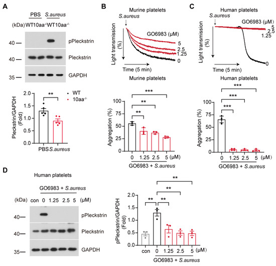 For the platelet aggregation assay, human platelets or washed wild type (WT) and 10aa−/− platelets (3 × 108/mL), pre-treated with GO6983 (1.25 µM, 2.5 µM, 5 µM) or MPαC (6.25 µM), were used in response to S. aureus at 37 °C under 1200 rpm stirring. Platelet aggregation was monitored using a Chrono-Log aggregometer (CHRONO-LOG700, Pennsylvania, USA) over 10 min.