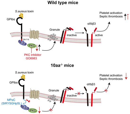 In the present study, we visualized the intravascular responses to S. aureus infection and demonstrated the importance of the GPIbα cytoplasmic tail in platelet clearance, microvascular thrombosis, and the propensity to survive sepsis. Specifically, the GPIbα cytoplasmic tail exacerbated sepsis-induced thrombosis by promoting platelet activation and its inflammatory response through the enhancement of the PKC signaling pathway (Scheme 1). These findings emphasize that PKC inhibition is a potential target for developing new drugs and the therapeutic treatment of thrombocytopenia and thrombosis caused by sepsis.