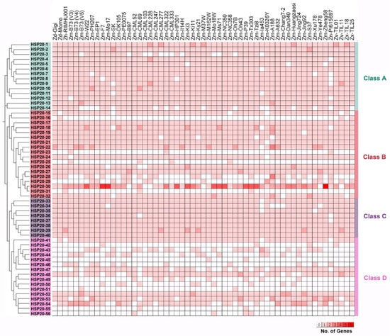 2.2. Presence and Absence of HSP20s in 55 Maize Inbreds or Relatives