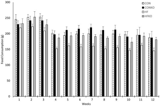 Comparison of weekly mean food consumption between dietary groups. Statistically significant between-subject effects were identified with lower food intake in the HF group when compared to both CON and HFKO groups (one-way repeated measures ANOVA, p < 0.05). Error bars represent SEM. n = 7–8 per group. CON: control diet; CONKO: control diet with krill oil supplementation; HF: high-fat diet; HFKO: high-fat diet with krill oil supplementation.