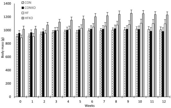 Baseline body mass was assessed at 16 months and then measured weekly. One-way repeated measures ANOVA was conducted to identify statistically significant, between-subjects effects. Overall, body weight increased for all groups when comparing baseline to week 12: CON, CONKO, HF, and HFKO mean body weight increased by 11.0%, 3.0%, 23.6% and 21.3%, respectively. Diet did elicit statistically significant changes in body weight over time, p = 0.021. Tukey HSD post hoc analysis demonstrated a statistically significant overall increase in body mass in HFKO when compared to CON (p = 0.019). Otherwise, no differences identified between dietary groups (Figure 2).
