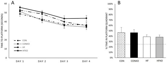 Morris water maze testing. (A) Time-to-platform for each dietary group on testing days 1–4. Although each group demonstrated learning with overall decreases in time-to-platform over the four testing days, diet did not induce statistically significant differences. (B) Morris water maze probe trial. No statistically significant differences were identified between groups when comparing the percentage of time spent in the removed platform quadrant. All groups showed a preference for the target quadrant with time spent greater than 25%. The dashed line indicates platform choice equivalent to random chance (25%). Error bars represent SEM. n = 7–8 per group. CON: control diet; CONKO: control diet with krill oil supplementation; HF: high-fat diet; HFKO: high-fat diet with krill oil supplementation.