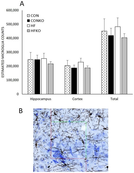 Stereology techniques were utilized to quantify microglia in the cortex and dentate gyrus, in addition to the total, combined counts of both regions (Figure 5). Diet did not induce statistically significant differences in microglia counts: CON (n = 4), CONKO (n = 6), HF (n = 4), and HFKO (n = 5). No statistically significant differences were identified between groups: hippocampus, p = 0.863; cortex, p = 0.623; combined, p = 0.797.