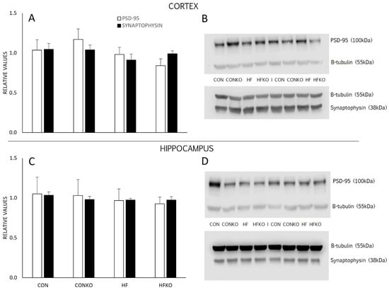 Synaptophysin and PSD-95 relative concentrations, with β-tubulin loading protein, were assessed as markers of synaptic density (Figure 7A,C). Diet did not induce statistically significant differences in synaptic density between groups in either the cortex or hippocampus tissue samples (Cortex: PSD-95, p = 0.226; SYP, p = 0.436. Hippocampus: PSD-95, p = 0.948; SYP, p = 0.643). The lack of significant differences is evident in the representative blots (Figure 7B,D).