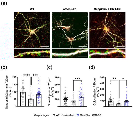 Thus, we aimed to verify whether GM1-OS can exert beneficial effects on Mecp2-deficient neurons maturation by using in vitro cultures of primary cortical neurons. As a readout of neuronal maturation, we analyzed synaptogenesis via immunostaining of synaptic puncta at 14 days in vitro (DIV14) with antibodies recognizing pre-synaptic (Synapsin 1/2, Syn) and post-synaptic (SH3 and multiple ankyrin repeat domains protein 2, Shank2) markers (Figure 1a). This time-point was selected as wild-type (WT) cortical neurons display fully functional synapses, while in Mecp2-ko neurons defects in synaptogenesis were demonstrated [,,]. By quantifying confocal images, we confirmed the reduction of Syn (mean ± standard error of the mean, SEM: WT = 100 ± 5.95, Mecp2-ko = 50.62 ± 5.46, p < 0.0001 WT vs. Mecp2-ko) and Shank2 (mean ± SEM: WT = 100 ± 9.66, Mecp2-ko = 68.31 ± 8.98, p = 0.096 WT vs. Mecp2-ko) puncta in Mecp2-null neurons with respect to WT neurons, as already described in literature [,] (Figure 1b,c). Conversely, GM1-OS administration for 14 days was able to significantly increase their levels (mean ± SEM of Syn of Mecp2-ko + GM1-OS = 81.72 ± 5.70, p = 0.0009 Mecp2-ko vs. Mecp2-ko + GM1-OS; mean ± SEM of Shank2 of Mecp2-ko + GM1-OS = 133.3 ± 12.04, p = 0.0002 Mecp2-ko vs. Mecp2-ko + GM1-OS; Figure 1). Moreover, analyzing the colocalization between Syn and Shank2 puncta, we assessed that Mecp2-null neurons displayed a significant recovery of the number of functional synapses upon GM1-OS treatment, restoring the physiological condition (mean ± SEM: WT = 100 ± 15.62; Mecp2-ko = 45.47 ± 5.34; Mecp2-ko + GM1-OS = 86.86 ± 12.88, p = 0.0496 Mecp2-ko vs. Mecp2-ko + GM1-OS; Figure 1d).