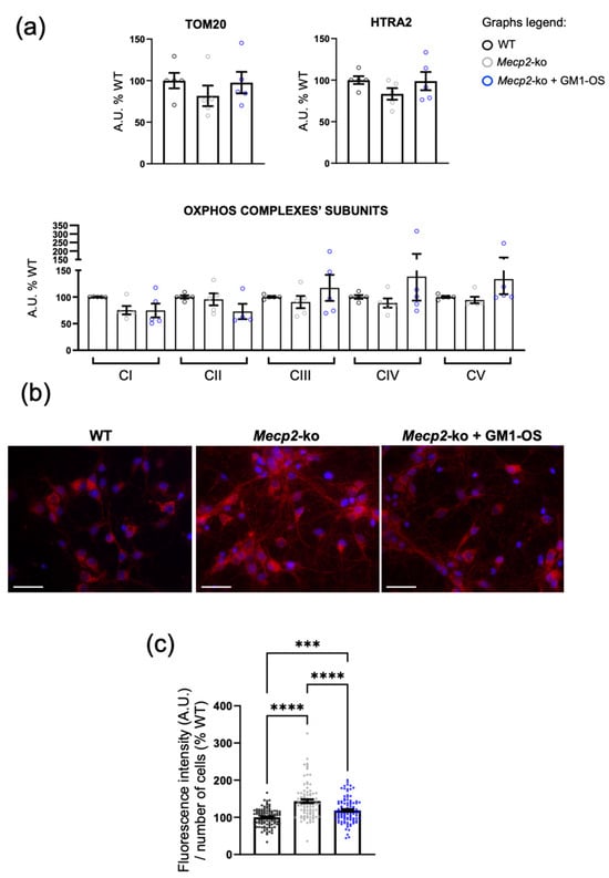 As shown in Figure 2a and in Supplementary Figure S1, no significant deregulation of analyzed mitochondrial proteins can be observed in Mecp2-null neurons at DIV7, and only a tendency of increased expression of complex IV (cytochrome c oxidase, mean ± SEM: WT = 100 ± 3.44; Mecp2-ko = 88.6 ± 8.72; Mecp2-ko + GM1-OS = 138.2 ± 45.02; p = 0.4100 Mecp2-ko vs. Mecp2-ko + GM1-OS.) and complex V (ATP-synthase, mean ± SEM: WT = 100 ± 1.93; Mecp2-ko = 94.3 ± 6.11; Mecp2-ko + GM1-OS = 133.5 ± 28.3; p = 0.2612 Mecp2-ko vs. Mecp2-ko + GM1-OS) subunits is evident in GM1-OS treated samples.
