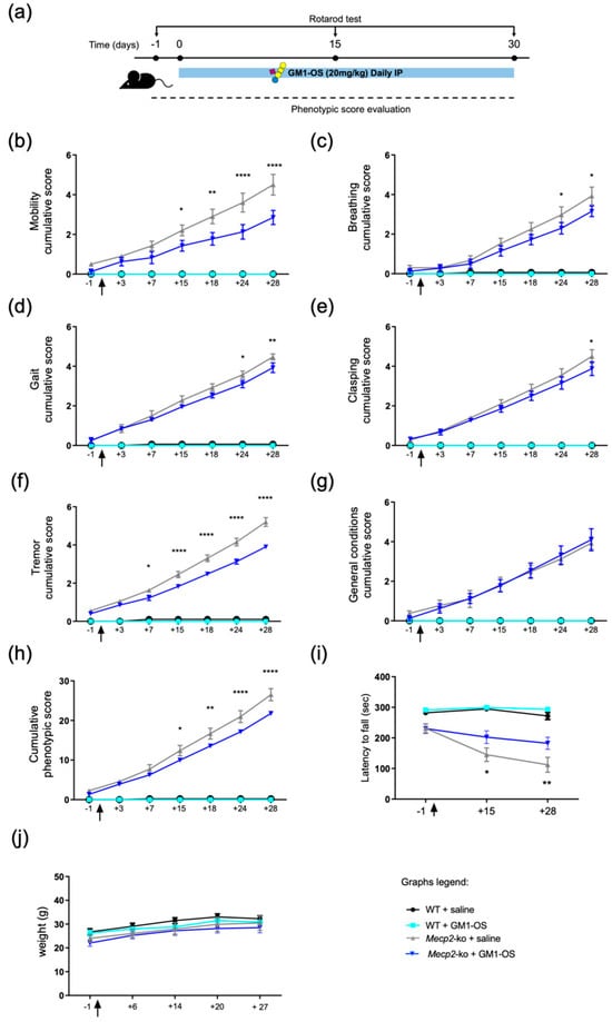 To measure the starting basal conditions and to monitor mice during the treatment, RTT-like symptoms were evaluated according to the well-defined Guy’s scoring system [,], and motor performance was tested before and along the treatment. The graphs depicted in Figure 3b–h clearly highlight the presence of RTT-like symptoms in Mecp2-ko mice compared with WT ones, as indicated by the score assigned to mobility, breathing, gait, clasping, tremor, and general condition and summarized in the cumulative phenotypic score (see Supplementary Tables S1–S7 for mean, SEM, and p-values for each parameter and time-point). Importantly, Figure 3h indicates that GM1-OS significantly ameliorated RTT-like symptoms starting from roughly 15 days of treatment (mean ± SEM: Mecp2-ko + saline = 12.37 ± 1.32; Mecp2-ko + GM1-OS = 9.97 ± 0.56; p = 0.0281 Mecp2-ko + saline vs. Mecp2-ko + GM1-OS).