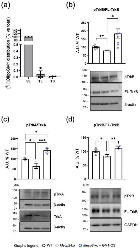 GM1-OS activation of Trk receptor at the PM in RTT models in vitro and in vivo. (a) Cortical neurons (DIV7) were incubated with 50 μM [3H]GM1-OS for 20 h. After pulse, the medium was withdrawn and collected. The cells were then washed with a medium supplemented with 10% fetal bovine serum (FBS) to gather SL fraction. The TL fraction was then obtained by washing the cells with a low concentrated trypsin solution. In order to collect the TS fraction, which represents the portion of the internalized GM1-OS, cells were finally lysed. Using liquid scintillation counting, the radioactivity associated with the medium and each fraction was ascertained. The graph displays the quantity of radioactivity that is still present after the medium has been removed. Data are expressed as mean ± SEM of total radioactivity percentage from three independent experiments. (b) Activation level of FL-TrkB receptor evaluated through WB by verifying the phosphorylation degree on lysates obtained from WT and Mecp2-null neurons (DIV7) treated with vehicle or 50 μM GM1-OS for 10 min. The graph depicts the degree of phosphorylation obtained by dividing the signal intensity of pTrkB by that of FL-TrkB. Data are expressed as mean ± SEM of the percentage respect to WT controls (mean ± SEM: WT = 100 ± 3.12; Mecp2-ko = 78.81 ± 2.8; Mecp2-ko + GM1-OS = 183.5 ± 28.05); values were obtained from three independent experiments in which pools of at least three different biological replicates per genotype were employed (p = 0.0014 WT vs. Mecp2-ko; p = 0.0572 WT vs. Mecp2-ko + GM1-OS; p = 0.0208 Mecp2-ko vs. Mecp2-ko + GM1-OS; ** p < 0.01, * p < 0.05 by Brown-Forsythe and Welch one-way ANOVA). (c,d) Activation level of TrkA and FL-TrkB receptor evaluated through WB by verifying the phosphorylation of TrkA (pTrkA, c) and of FL-TrkB (pTrkB, d) on lysates obtained from WT and Mecp2-null cortices of mice treated with saline or GM1-OS (20 mg/Kg) for 4 weeks (the last injection was performed 2 h before sacrifice). The graph shows the phosphorylation level that results from dividing the phosphorylation signal (normalized by β-actin or glyceraldehyde-3-phosphate dehydrogenase, GADPH) by the total TrkA or FL-TrkB intensity (normalized by β-actin or GADPH). Values are expressed as mean ± SEM of the percentage respect to WT controls (mean ± SEM of pTRKA/TRKA: WT = 100 ± 4.04; Mecp2-ko = 64 ± 11.53; Mecp2-ko + GM1-OS = 143 ± 9.71; mean ± SEM of pTRKB/FL-TRKB: WT = 100 ± 5.33; Mecp2-ko = 84.01 ± 4.4; Mecp2-ko + GM1-OS= 112.4 ± 3.8). Asterisks highlight a significant difference evaluated by one-way ANOVA followed by Fisher’s LSD post hoc test (pTrkA/TrkA: p = 0.0302 WT vs. Mecp2-ko; p = 0.0150 WT vs. Mecp2-ko + GM1-OS; p = 0.0008 Mecp2-ko vs. Mecp2-ko + GM1-OS; pTrkB/FL-TrkB: p = 0.0456 WT vs. Mecp2-ko; p = 0.083 WT vs. Mecp2-ko + GM1-OS; p = 0.003; Mecp2-ko vs. Mecp2-ko + GM1-OS; *** p < 0.001, ** p < 0.01, * p < 0.05). WT + saline, n = 4; Mecp2-ko + saline, n = 3; Mecp2-ko + GM1-OS, n = 3–4.