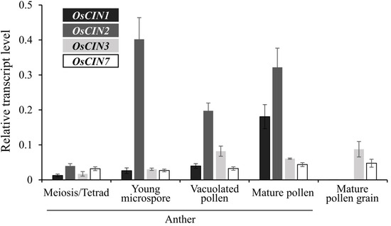 RT-qPCR analysis further confirmed the expression patterns of OsCIN genes in the anthers during pollen development, which showed results highly consistent with those of the digital Northern analysis (Figure 1). Due to the difficulty of isolating pollen from the anther tissues at earlier developmental stages, we conducted the analysis using entire anthers. OsCIN1 exhibited the highest expression in the mature pollen stage, while OsCIN2 showed strong expression starting from the young microspore stage, continuing up to the mature pollen stage. Notably, neither OsCIN1 nor OsCIN2 was expressed in mature pollen grains, which can be isolated from the anthers at the mature stage. Additionally, although OsCIN3 and OsCIN7 were detected in the anthers during pollen development, their expression was very low. OsCIN3 showed a slight increase in expression in the anthers during the vacuolated pollen stage. It was confirmed that the accumulation of both OsCIN3 and OsCIN7 transcripts originated from the pollen grains rather than the anthers (Figure 1).