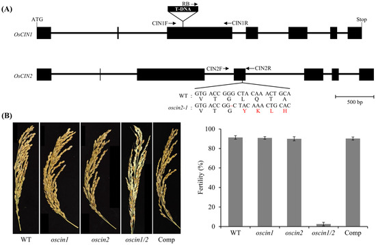 To determine whether the double mutation of OsCIN1 and OsCIN2 was responsible for the male sterility phenotype, we introduced OsCIN1 cDNA under the control of the CaMV 35S promoter (p35S) into japonica rice cv. Dongjin via Agrobacterium-mediated transformation. After selecting three transgenic plants overexpressing OsCIN1, they were crossed with oscin1/2 double mutants. Progeny from the F1 plants were obtained, and those with the oscin1/oscin2/p35S:OsCIN1 genotype were identified using genomic DNA PCR for OsCIN1 and sequencing for OsCIN2. Finally, OsCIN1 cDNA-carrying oscin1/2 double-homozygous plants were selected and designated as Comp lines. The genotypes of and OsCIN1 expression levels in the Comp plants were confirmed (Figure S2). Among the lines, Comp #2, which had the highest expression of the introduced OsCIN1 transgene, was chosen for further analysis. The seed-setting rate of the Comp #2 line was comparable to the setting rates of WT, oscin1, and oscin2 (Figure 2B), suggesting that the overexpression of OsCIN1 can rescue seed fertility in oscin1/2.
