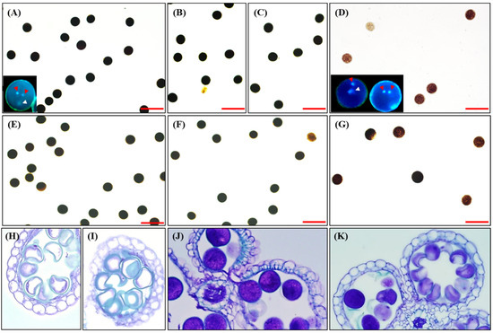 Anthers at various developmental stages were prepared for sectioning according to the protocol described by Moon et al. [28]. Briefly, harvested anthers were fixed in a formalin–acetic acid–alcohol solution for 8 h, embedded in Technovit® 8100 resin (Kulzer, Hanau, Germany), and sectioned to a thickness of approximately 10 μm using a rotary microtome (Leica RM2165, Leica Microsystems, Wetzlar, Germany). The sections were stained with 0.1% toluidine blue O (Sigma-Aldrich, St. Louis, MO, USA) dissolved in 1% sodium chloride solution and observed under an Olympus BX61 microscope (Olympus, Tokyo, Japan).