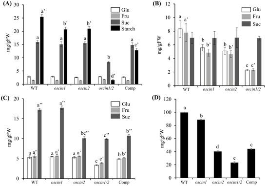 In seeds, the sucrose levels were decreased three days after fertilization in oscin2, oscin1/2, and Comp #2. The glucose and fructose levels decreased only in oscin1/2 seeds (Figure 6C). The starch levels were significantly reduced in oscin2, oscin1/2, and Comp #2, with a slight reduction observed in oscin1 (Figure 6D). These findings are consistent with the observed seed phenotypes and measured CIN activity levels in seeds (Figure 4 and Figure 5B). Studying seeds is crucial because proper sucrose metabolism and allocation during early seed development are essential for successful grain filling and crop yields. The significant reductions in starch and sugar content observed in the seeds of the mutants underscore the vital role of CIN in carbohydrate metabolism during early seed formation.