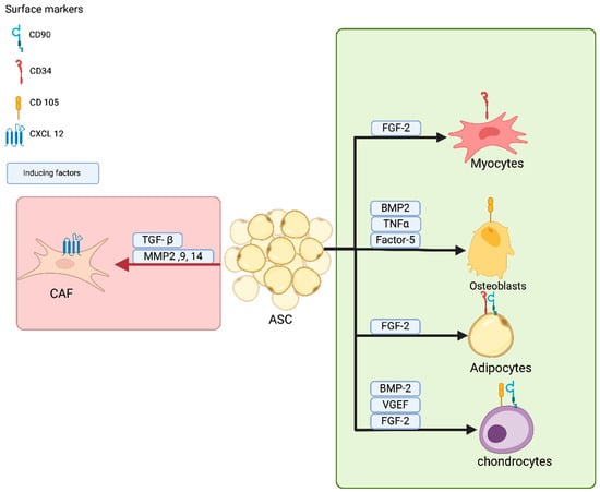 TGF-β is a potent inducer of ASC differentiation into CAFs. Exposure to TGF-β1 can promote the expression of CAF markers such as fibroblast-specific protein 1 (FSP1), vimentin, collagen type I alpha 1 (Col1α1), and chemokine (C-X-C motif) ligand 12 (CXCL12) in ASCs [21]. TGF-β signaling not only drives the differentiation process but also enhances the tumor-promoting functions of CAFs, including their role in immune evasion and angiogenesis [5].