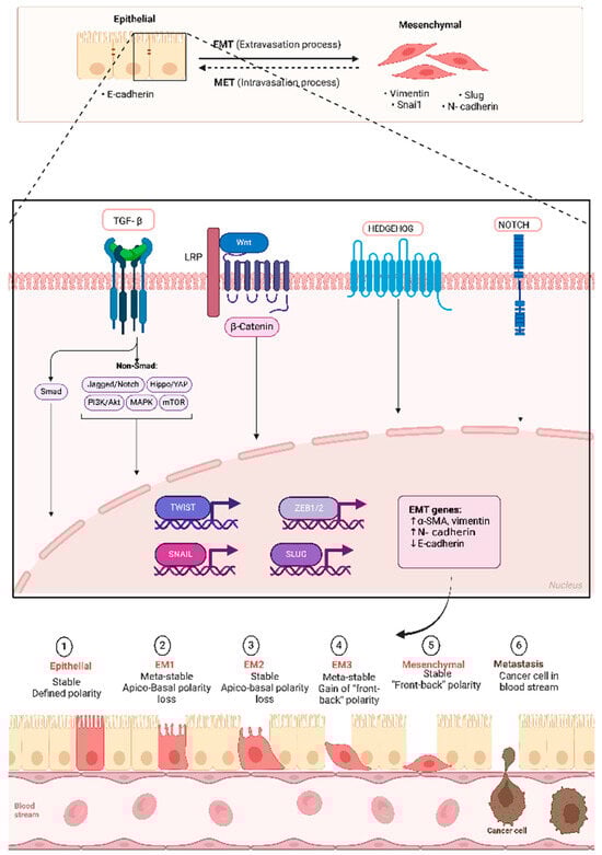 The epithelial-to-mesenchymal transition (EMT) is a biological process where epithelial cells lose their cell polarity and cell–cell adhesion properties, acquiring migratory and invasive characteristics typical of mesenchymal cells [8]. This transition is crucial in various physiological processes, including embryogenesis, wound healing, and tissue regeneration, but it is also implicated in cancer progression and metastasis [9]. In cancer, the EMT facilitates the metastatic cascade by enabling tumor cells to invade surrounding tissues, enter the bloodstream, and colonize distant organs (Figure 2) [9,10]. During the EMT, cells undergo significant morphological changes, characterized by the loss of epithelial markers like E-cadherin and the gain of mesenchymal markers such as N-cadherin and vimentin (Table 1) [11]. This transition enhances cancer cells’ invasive capabilities, allowing them to penetrate the extracellular matrix (ECM) and migrate to distant sites.