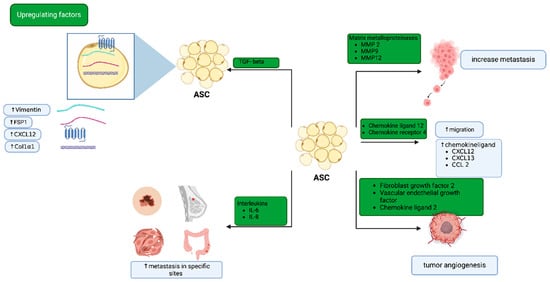 The co-culture of ASCs with cancer cells leads to increased expression of MMPs, such as MMP-2, MMP-9, and MMP-14, in both ASCs and cancer cells. This enhanced MMP expression is linked to increased invasion and metastasis [5,25]. MMPs facilitate the degradation of the extracellular matrix (ECM), allowing for greater tumor cell migration and invasion [5].