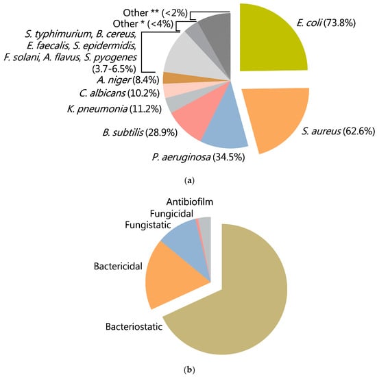 Diagram illustrating the distribution of CuO-NPs-sensitive microorganisms reported in the literature (a); diagram illustrating the distribution of biological effects of CuO-NPs reported in the literature (b); *—H. pylori, V. cholera, S. mutans, P. vulgaris; **—A. hydrophila, C. tropicalis, E. tarda, E. aerogenes, K. aerogenes, A. solani, L. monocytogenes, B. megatarium, P. fluorescens, P. mirabilis, Proteus sp., R. solanacearum, Penicillium sp.