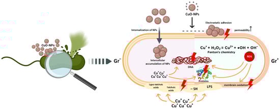 The contact interaction of CopOx-NPs with the surface of bacterial cells, as is the case with many other metal and metal oxide NPs, is one of the most frequently reported mechanisms of their antibacterial activity [137]. In the literature, this type of antibacterial effect of nanomaterials is often referred to as “contact killing.” It is well established that the majority of metal nanoparticles and metal oxides possess a positive surface charge. Conversely, the surface of bacterial cells, including both Gram-positive and Gram-negative varieties, is negatively charged. The negative surface charge of Gram-positive bacteria is attributed to the high content of anionic cell wall polymers, including peptidoglycan, which is rich in carboxyl groups of γ-glutamic and meso-diaminopimelic acids, terminal residues of d-Alanine peptide subunits, and teichoic and lipoteichoic acids, which are rich in phosphate groups. In contrast, the negative surface charge of Gram-negative bacteria is attributed to the presence of acidic phospholipids and a limited amount of basic proteins in the outer membrane composition [138]. Due to the action of electrostatic forces, CopOx-NPs are adsorbed onto the surface of bacterial cells, thereby facilitating the destruction of the cell wall. This process increases cell permeability and facilitates the internalization of NPs into the cell [107]. Copper cations (Cu+ and Cu2+) formed during the leaching of CopOx-NPs can also bind to negatively charged groups of the cell membrane, thereby reducing the membrane potential difference and causing depolarization. This results in damage or rupture of the cell membrane, leakage of cell contents, and, ultimately, death of the bacterial cell [47]. The ultrastructure of bacterial cells exposed to CopOx-NPs has been examined through the use of transmission electron microscopy (TEM) or scanning electron microscopy (SEM) in a number of experimental studies (see Supplementary Materials Figures S1–S3). In particular, Chen et al. demonstrated that CopOx-NPs caused multiple structural damages and aggregation on the surface of soilborne Ralstonia solanacearum cells [37]. Halbus et al. [40] demonstrated the extensive accumulation of both pure CopOx-NPs and CopOx-NPs functionalized with GLYMO on the surfaces of E. coli cells at a concentration of 25 μg/mL using TEM and SEM. Gopinath et al. demonstrated a change in bacterial cell morphology following a 60 min exposure to CuO-NPs prepared using Tribulus terrestris extract [65]. In a recent study by Shehabeldine et al. [79], the ultrastructure of bacterial cells following the application of CuO-NPs was investigated using TEM. An abundant accumulation of CuO-NPs was observed in proximity to the bacterial cells, accompanied by notable alterations in bacterial morphology. These included cell wall ruptures, decreased electron density, a considerable concentration of minute particles within the cell wall and cytoplasm, a loss of smoothness and uniformity in the cell membrane, cell lysis, and the leakage of intracellular material. The ultrastructural analysis of the TEM of bacterial cells incubated with CuO-NPs synthesized using the extract of the fungus Ganoderma sessile revealed the accumulation of CuO-NPs on the surfaces of S. aureus, E. coli, and P. aeruginosa [118]. Utilizing scanning SEM, Hesabizadeh et al. observed the attachment of CuO-NPs to the cells of both Gram-positive and Gram-negative bacteria. Additionally, bacterial cells treated with CuO/Cu2O-NPs exhibited notable damage to the cell wall and membrane, accompanied by the leakage of intracellular contents and complete cell lysis [107]. Additionally, in the recent work of Rivera-Mendoza et al. [112], it was demonstrated that the growth inhibition of C. jejuni upon the addition of CuO-NPs occurred through the attachment of the NPs to the outer cell membrane and subsequent internalization into the cell, a process that was confirmed by TEM.