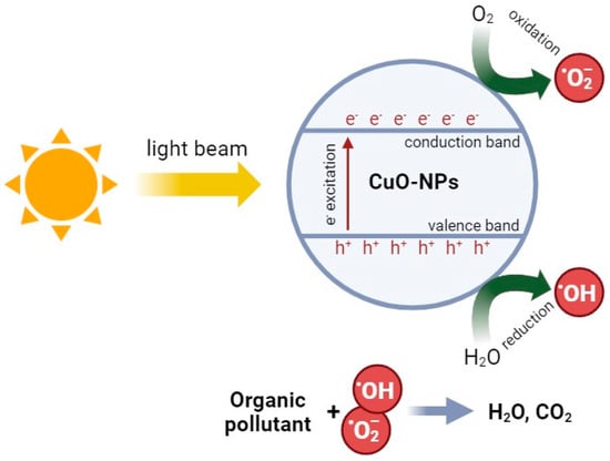 Another biologically useful physical property of CopOx-NPs is their photocatalytic activity [145]. A substantial body of research has proposed the use of these nanoparticles as a solution for the treatment of wastewater containing organic and inorganic pollutants. CuO is a semiconductor with a narrow forbidden energy zone (~1.6 eV), rendering it active in the visible wavelength region of the electromagnetic spectrum [20]. The general mechanism of ROS formation in the course of photocatalytic reactions on the surface of CopOx-NPs can be described as follows: irradiation of CopOx-NPs with light in the visible range leads to the generation of electron–hole pairs in the volume of NPs. Photons of incident radiation promote electrons from the valence band (VB) to the conduction band (CB) of the semiconductor, leaving holes (h+) in the VB. The electrons (e−) and holes (h+) generated on the surface of CopOx-NPs react with water and dissolved oxygen to form ROS. The presence of excited electrons in the CB results in a reduction in oxygen molecules to superoxide anion radicals (O2•–) and a reduction in H2O2 to hydroxyl radicals (·OH), which further contribute to the oxidative decomposition of organic molecules or dyes to CO2, H2O, and other products [103,146] (Figure 5).