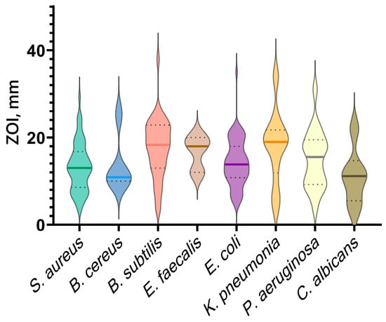 Analysis of the literature data revealed a wide range of Gram-positive and Gram-negative bacterial species, as well as some fungal species, that are sensitive to CuO-NPs (Table 1). The graph (Figure 6) shows the reported ZOI (zone of inhibition) values for the most commonly studied microorganism species. For all microorganism species considered, the average size of the zone of inhibition is in the range of 10–20 mm. The most pronounced sensitivity to CuO-NPs is observed for Bacillus subtilis, Enterococcus faecalis, Pseudomonas aeruginosa, and Klebsiella pneumonia. It should be noted that the disk diffusion method often used by the authors of the studies has a number of limitations that make it difficult to compare the results obtained with other works. For example, the results of disk diffusion analysis may vary depending on the composition of the agar medium, its density, and the uniformity of filling the Petri dish. Often, inhomogeneities or errors in the preparation of the medium can affect the accuracy of the measurements. It should also be noted that different bacterial strains may have different sensitivity thresholds, making the interpretation of inhibition zones a complex and standard-dependent task. Therefore, we also compared the antibacterial efficacy of CuO NPs application based on reported minimum inhibitory concentration (MIC) data for Gram-positive and Gram-negative bacterial species; the results of this analysis are presented in the next section.