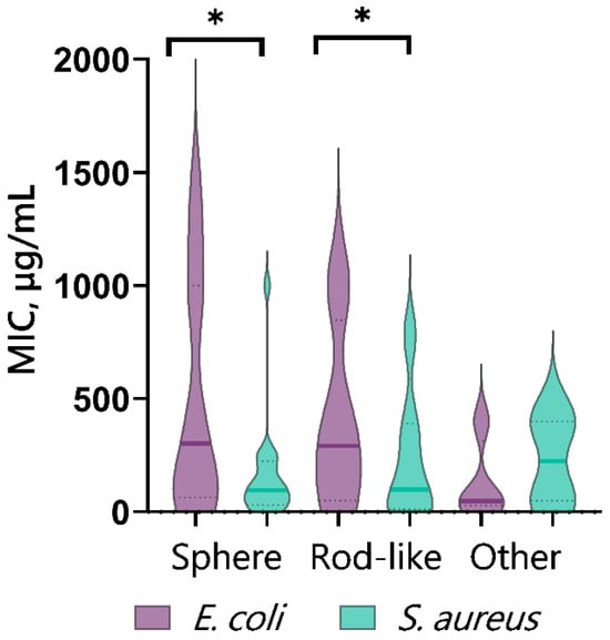 During the analysis of the literature data, we compared the reported bacteriostatic activity of CuO-NPs against Gram-positive (S. aureus as an example) and Gram-negative (E. coli as an example) bacteria when exposed to different forms of these nanoparticles—spherical, rod-shaped (as the most common), and “other”. (Figure 7). There was a decrease in the average MIC value for S. aureus both when spherical NPs were added and when rod-shaped CuO NPs were used. The results obtained by analyzing the publications indicate that the sensitivity of Gram-positive bacteria S. aureus to CuO-NPs was higher compared to E. coli. It is also worth noting the opposite effect for CuO-NPs with “other” morphology, which may be due to the small sample size and insufficient number of reports on the minimum inhibitory concentrations for these nanoparticles.