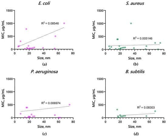 Nanoparticles of smaller size are known to be more reactive due to their larger specific surface area, and consequently, a lower concentration is required to achieve an antibacterial effect. Due to the fact that the activity of nanomaterials may vary with their size, we also analyzed the available data on the bacteriostatic activity of CuO NPs based on published MIC values against Gram-positive (S. aureus, B. subtilis) and Gram-negative (E. coli, P. aeruginosa) bacteria as a function of the size of the NPs introduced (Figure 8a–d). For all microorganisms considered, a tendency to decrease MIC (increase in antibacterial potential) with decreasing size of CuO NPs is observed. The graphs also show that the highest density of points is concentrated in the range of 20 ± 10 nm, indicating a tendency to increase the inhibitory activity of CuO-NPs in this size range.