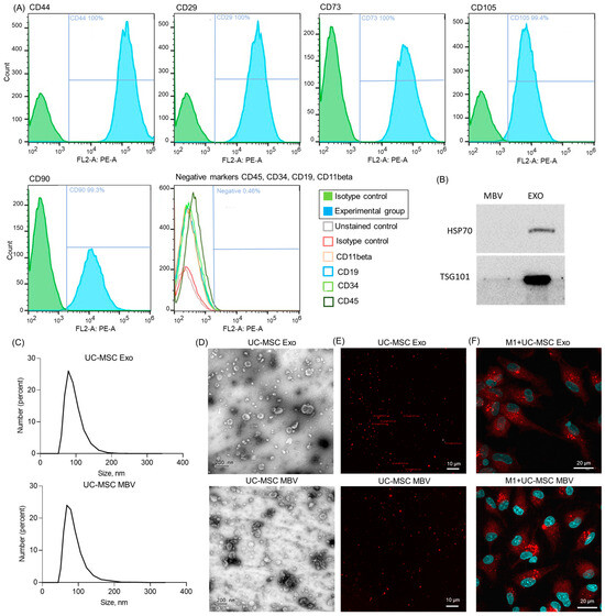 Characterization of UC-MSC exosomes and UC-MSC MBV. (A) Flow cytometry results show the presence of phenotypic markers for UC-MSC (CD105, CD73, CD90, CD29, CD44) and the absence of hematopoietic markers (CD19, CD11beta, CD45, CD34). (B) Western blot analysis of UC-MSC Exo for the presence of exosomal markers (HSP70+, TSG101+). (C) Particle size distribution obtained by nanoparticle dynamic light scattering. (D,E) Visualization of UC-MSC Exo and UC-MSC MBV via TEM and confocal microscopy with fluorescent staining of extracellular vesicles using PKH26. (F) Phagocytosis of UC-MSC Exo and UC-MSC MBV labeled with PKH26 by M1 (IFN-γ + LPS) macrophages.
