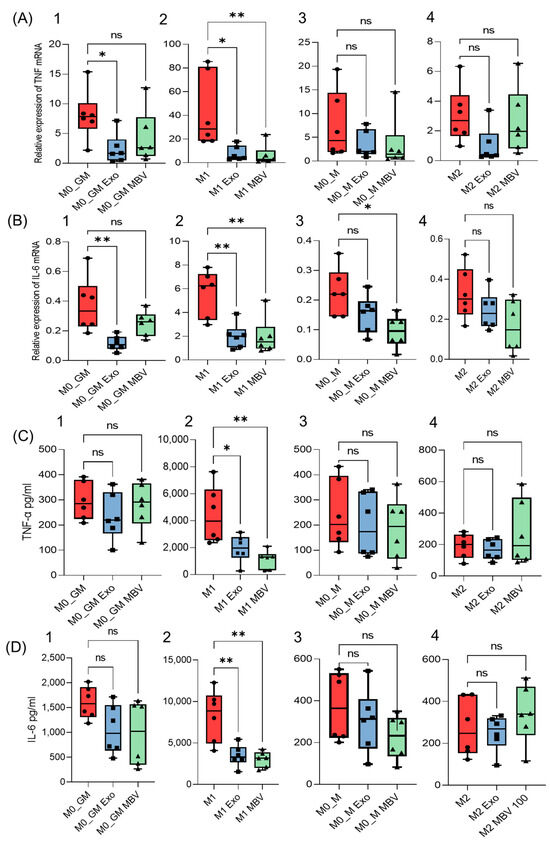 Modulation of pro-inflammatory cytokine levels in MDM by exosomes and MBV derived from UC-MSC. Results of qRT-PCR for (A)—TNFα, (B)—IL-6, and ELISA for (C)—TNFα, (D)—IL-6 for the following macrophage phenotypes: 1. M0_GM, 2. M1, 3. M0_M, 4. M2. * p < 0.05; ** p < 0.01; ns (p > 0.05). The figures (circle, square, triangle) on the graphs indicate the concentration of the studied protein or the level of mRNA expression in the experimental sample: ● (control group); ■ (experimental group + exosomes); ▲ (experimental group + MBV).