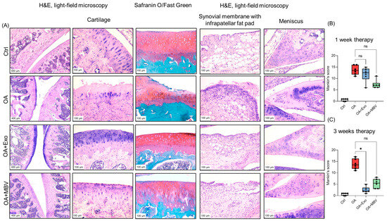 Histochemical analysis of the impact of EV (exosomes and MBV) from UC-MSC on the progression of pathological changes in articular tissues (cartilage, synovial membrane, infrapatellar fat pad, meniscus) in rats with surgically induced OA. (A) Histological staining with H&E, Safranin O/Fast Green. The images depict histological sections of animals 3 weeks post-OA therapy. Ctrl—intact control without surgery, OA—OA group injected intra-articularly with PBS, OA + Exo—group with intra-articular injection of EV from UC-MSC secretome, OA + MBV—group with intra-articular injection of MBV from UC-MSC. Scale bar: 100 µm. (B,C) Semi-quantitative evaluation of changes in cartilage tissue was conducted using the Mankin scoring method. B. One week after intra-articular injection of EV (exosomes and MBV) from UC-MSC. C. Three weeks after intra-articular injection of EV (exosomes and MBV) from UC-MSC. Experimental results are presented as boxplots showing the median ± minimum and maximum values. * p < 0.05; ns (p > 0.05). The figures (circle, square, triangle) on the graphs indicate the Mankin’s scores ● (control group); ■ (OA group); ▲ (experimental group + exosomes); ▼ (experimental group + MBV).