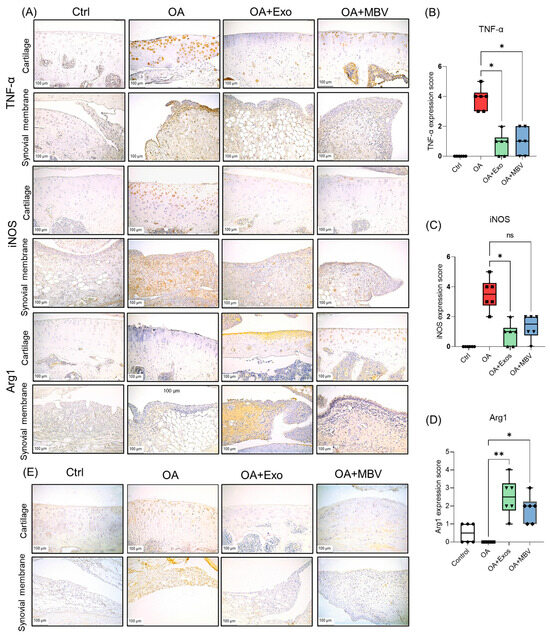 Additionally, to analyze the impact of different types of EV on inflammatory processes in OA, we conducted an immunohistochemical (IHC) analysis of markers associated with OA-related inflammation. Markers linked to the inflammatory tissue microenvironment in OA, including TNF-α and inducible nitric oxide synthase (iNOS), were selected, along with arginase (Arg1), a marker associated with anti-inflammatory responses (Figure 4A). In the intact control group, almost no expression of TNF-α and iNOS was observed (Figure 4A). In the OA group without EV treatment, significant expression of these markers was observed in chondrocytes of dystrophic and degrading articular cartilage, as well as in numerous macrophages and fibroblasts in the synovial membrane and infrapatellar fat pad (Figure 4A–C). Unlike TNF-α, iNOS was also highly expressed in endothelial cells of the synovial membrane. High expression of these proteins indicated a pronounced inflammatory reaction in joint tissues in OA samples on day 42 post-meniscectomy for OA induction. Meanwhile, Arg1 was detected only in isolated macrophages of the synovial membrane and infrapatellar fat pad and a few chondrocytes in the articular cartilage of the intact control and was completely absent in the tissue samples from the OA group (Figure 4A,D). After three weeks following the injection of both types of UC-MSC EV, treatment with exosomes and MBV significantly reduced the expression of inflammatory markers TNF-α, to a lesser extent iNOS, and markedly increased Arg1 expression, indicating a strong anti-inflammatory effect of both types of EV (Figure 4A–D). The reduction in TNF-α and iNOS was predominantly observed in articular cartilage, synovial membrane and infrapatellar fat pad cells (Figure 4A). Strong Arg1 expression was primarily detected in the superficial zone of the articular cartilage and in macrophages infrapatellar fat pad (Figure 4A). Semi-quantitative evaluation of the expression of immunohistochemical markers demonstrated a statistically significant inhibitory effect of exosomes on TNF-α and iNOS expression levels (Figure 4B,C). MBV showed a weaker and statistically insignificant effect on the reduction in iNOS expression compared to TNF-α when compared with exosomes (Figure 4B,C). The impact of MBV and UC-MSC exosomes on Arg1 levels served as an indicator of a significant reduction in inflammation in the synovial and infrapatellar fat pad tissues due to the shift in macrophage polarization towards a phenotype with a more pronounced anti-inflammatory profile (Figure 4D). Micrographs and additional graphs of IHC results for TNF-α, iNOS and Arg-1 markers in individual tissues such as cartilage and infrapatellar fat pad have been added to Supplementary Materials Figures S8 and S9.