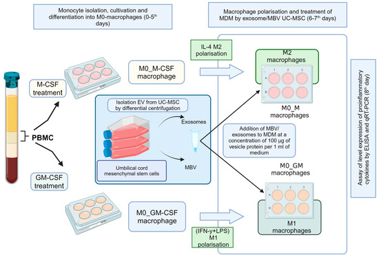 Monocytes were isolated from PBMC and obtained from healthy volunteers by age 18–60 years, with a body mass index of 18.5–24.9. All donors signed an informed consent form approved by the local ethics committee of Sechenov University (No. 16–21, 16 September 2021, Moscow, Russia). The isolation of PBMC and the culturing of monocyte-derived macrophages (MDM) were performed according to the standard protocols we described previously [57]. Macrophages were cultured in medium containing 50 ng/mL of GM-CSF or 50 ng/mL of M-CSF (SCI-store, Moscow, Russia), with medium changes on day 3. On day 6, the medium was changed again, leaving part of the MDM for both growth factors unpolarized as M0_GM and M0_M. For M1 macrophage polarization, LPS 10 ng/mL (Thermo Fisher Scientific, Carlsbad, CA, USA) and IFN-γ 50 ng/mL (Thermo Fisher Scientific, USA) were added; for M2 polarization, IL-4 25 ng/mL (SCI-store, Moscow, Russia) was added. MBV or exosomes from UC-MSC were then added to the cells at a concentration of 100 µg of vesicle protein per 1 mL of medium, while no additives were made to the control samples. MDMs were cultured with EV and polarization inducers for 48 h, after which the medium was collected for cytokine measurements, and cells were lysed to extract RNA. A detailed Scheme of the experiments with MDM and UC-MSC EV can be seen in Figure 5. To measure the expression and secretion levels of pro-inflammatory cytokines using qRT-PCR and ELISA, respectively, at least 6 experiments were conducted with 3 technical replicates for each sample.