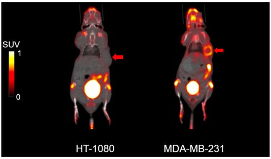 Representative [18F]FAPI-74 PET images of HT1080 and MDA-MB-231 xenograft models. The tumors are indicated by arrows.