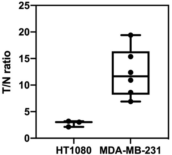 The PET imaging results are shown in Figure 1. All data from the mice are presented in Supplementary Figures S1 and S2. In comparing MDA-MB-231 (n = 6) and HT1080 xenografts (n = 3), [18F]FAPI-74 PET showed higher uptake in the former (median SUVmax, 1.10 [range, 0.97–2.96] with a median T/N ratio of 11.65 [range, 6.90–19.41]) than in the latter (median SUVmax, 0.22 [range, 0.20–0.27] with a mean T/N ratio of 3.03 [range, 2.13–3.20]) (p = 0.016, p = 0.003, and p = 0.016) (Figure 2). No metastatic findings were detected, as verified by PET imaging and autopsy examinations.