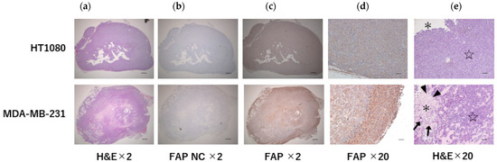 Histological and immunohistochemical staining of xenografts. FAP expression observed in the MDA-MB-231 xenograft. FAP immunohistochemical staining was more intense at the tumor margins. (a) Tumor: H&E; (b) tumor: FAP immunohistochemical staining negative control; (c) tumor: FAP immunohistochemical staining; (d) tumor margin: FAP immunohistochemical staining; (e) border between the center (asterisk) and the margin (star) of the tumor. In MDA-MB-231, xenograft karyolysis, cytoplasmic swelling (arrow), apoptotic bodies, and chromatin aggregation (arrowhead) were observed; in the central legions: H&E was observed. NC: negative control; ×2 images; scale bars = 500 μm, ×20 images; scale bars = 50 μm.