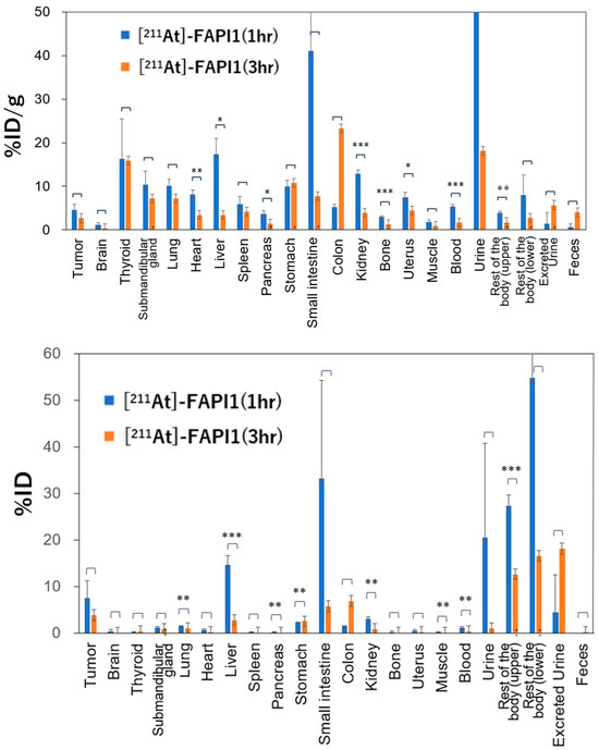 %ID/g and %ID of [211At]FAPI1 in various organs at 1 h and 3 h post-injection. * p < 0.05, ** p < 0.01, and *** p < 0.005.