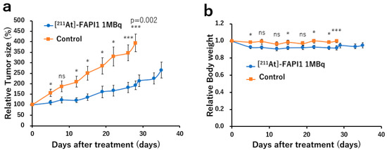 Changes in tumor size and relative body weight in [211At]FAPI1 and control groups. (a) Relative tumor size and (b) relative body weight. * p < 0.05 and *** p < 0.005; ns = not significant.