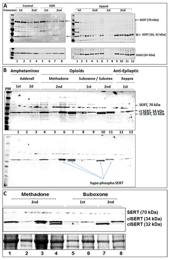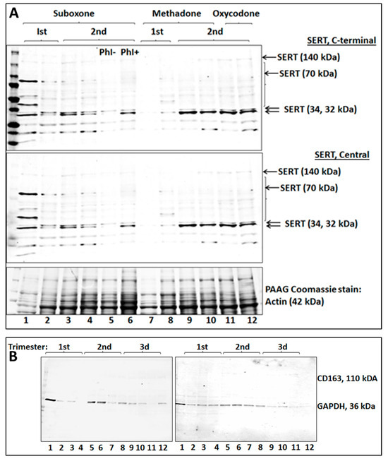 Changes in opioid-exposed placental SERT expression and modification relative to housekeeping proteins and unexposed controls were measured by quantitative western blotting, as previously described [