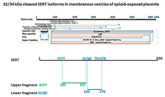 http://www.uniprot.org/uniprot/P31645#P31645, 1 October 2014 to 2 October 2024, gene names SLC6A4; synonyms: HTT, SERT; Organism Homo sapiens (Human), Taxonomic identifier9606 [NCBI]). The first four amino acids of the central region of SERT were detected in the upper fragment corresponding to the sequence of SERT; the lower band corresponded to the C-terminal region of SERT. In combination with the western blot results, this confirmed the presence of truncated SERT protein in opioid-exposed placental vesicles.