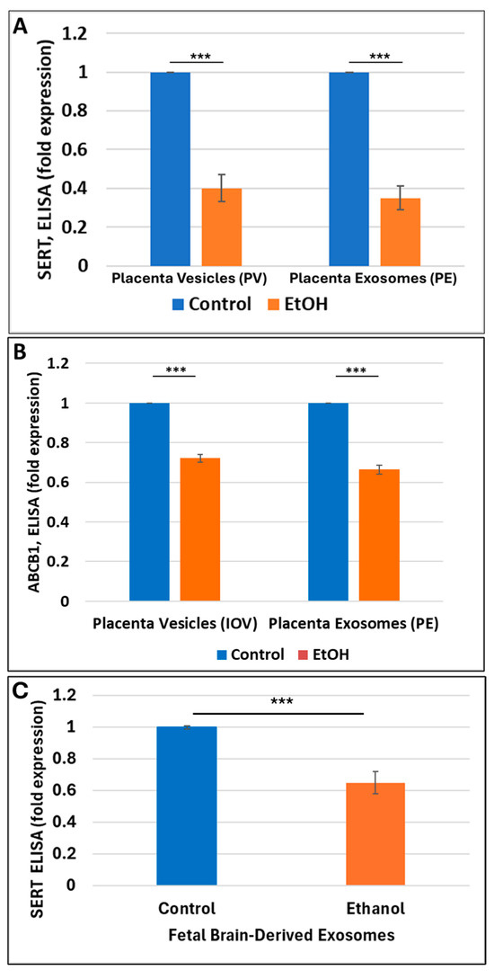 7]. In the present study, this strategy was further developed to investigate SERT in the placenta and in PEs. Maternal serum proteins have been used to predict infant outcomes and might be useful in classifying difficult-to-diagnose FASD subpopulations. However, the ability to isolate PEs non-invasively from maternal blood and analyze their cargos, e.g., for SERT and its isoforms, as early as the first trimester, might prove more specific in identifying molecular markers to predict the emergence of neurodevelopmental abnormalities such as FASD and opioid abstinence syndrome in at-risk children.