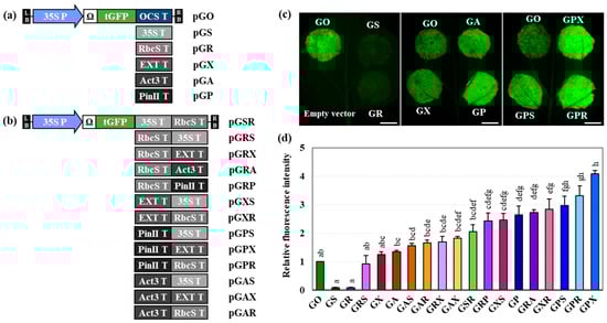 The leaf samples infiltrated with GX, GA, or GP exhibited higher fluorescence intensities than the GO-infiltrated leaf sample, with the fluorescence intensity of the GP-infiltrated leaf sample being the highest among the constructs with a single terminator, at approximately 2.6-fold that of the GO-infiltrated leaf sample (Figure 1d). Interestingly, GRS (tGFP:RbcST–35ST) induced the lowest fluorescence intensity among the constructs with double terminators (Figure 1d). However, the fluorescence intensity of the GRS-infiltrated leaf sample was 92% that of the GO-infiltrated leaf sample, which was 9.8-fold higher than that of GS (Figure 1d). GSR (tGFP:35ST–RbcST) exhibited a 24.4-fold higher fluorescence intensity than GS, which was 2.1-fold higher than that of GO (Figure 1d). The fluorescence intensities of GPS (tGFP:PinIIT–35ST), GPR (tGFP:PinIIT–RbcST), and GPX (tGFP:PinIIT–ExtT), which are constructs with double terminators wherein another terminator was added to the 3′-end of PinIIT, were the highest—3.0–4.1-fold higher than those of GO and approximately 1.2–1.7-fold higher than those of GP (Figure 1d). The fluorescence intensities of GPR and GPS with PinIIT significantly increased by approximately 35-fold compared to those of GR and GS, which exhibited significantly low fluorescence intensities. They had the second- and third-highest fluorescence intensities, respectively, among the 13 constructs with double-terminator combinations. Furthermore, the fluorescence intensity of the GRP (tGFP:RbcST–PinIIT)-infiltrated leaf sample was 2.4-fold higher than that of the GO-infiltrated leaf sample but only 68% higher than that of the GPR-infiltrated leaf sample (Figure 1d).