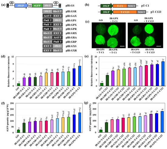 The ranking of tGFP content was slightly different from the ranking of relative fluorescence intensity. For co-expression of T–C1 or T–C123, the top three rankings for relative fluorescence intensity and tGFP content were similar to each other but otherwise differed slightly (Figure 2d–g). tGFP levels ranged from 82.7 to 169.8 μg/g LFW with T–C1 co-expression (Figure 2f) and 85.1–180.4 μg/g LFW with T–C123 co-expression (Figure 2g). The top six constructs that showed the highest tGFP content upon co-expression with T–C1 (IR:GAX, IR:GSR, IR:GPR, IR:GRX, IR:GPS, and IR:GPX) or T–C123 (IR:GRX, IR:GSR, IR:GRA, IR:GPR, IR:GPS, and IR:GPX) were used for further investigation (Figure 2f,g).