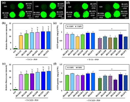 Relative tGFP fluorescence intensities and quantities in N. benthamiana leaf samples co-infiltrated with the vector constructs for tGFP expression containing double terminators, pT–C123, and P19 at 3 and 5 DPI. (a,d) tGFP fluorescence of each construct upon transient expression at (a) 3 and (d) 5 DPI. Scale bar: 1 cm. (b,c) The relative tGFP fluorescence intensity of leaf samples co-infiltrated with the replicating vector construct, P19, and (b) T–C1 or (c) T–C123. The values were statistically analyzed using a one-way ANOVA followed by Tukey’s test (p < 0.05). (e,f) tGFP quantity of leaf samples co-infiltrated with the replicating vector construct, P19, and (e) T–C1, or (f) T–C123 at 3 and 5 DPI. The values were statistically analyzed using Wilcoxon’s signed-rank test (* p < 0.05).