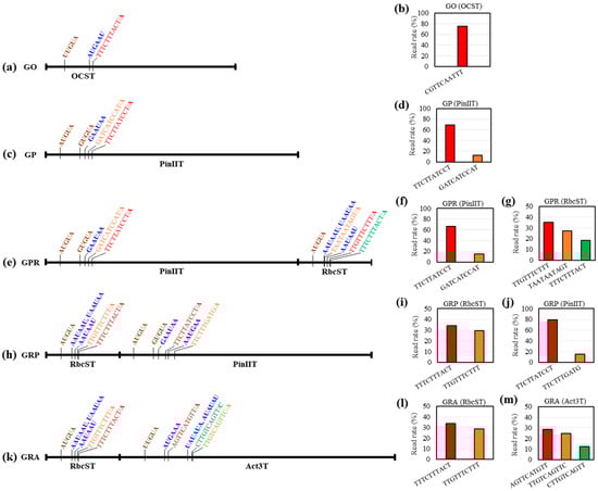 In the cRT-PCR product from the GRP-infiltrated leaf samples (Figure 5h–j), the primary PA site (TTCTTATCCT/A) of PinIIT was consistent with that of GP and GPR, but the percentage was 79.6%, which was approximately 10% higher than that of GP and GPR (Figure 5h,j). In contrast, the minor PA site (TTCTTTGATG/A) differed from GATCATCCATA in GP and GPR (Figure 5d,f,j). However, differences were observed in the ranking and proportion of each PA site for RbcST in GRP, in contrast to the GPR results. The highest proportion of PA sites in the RbcST of GPR and GRP were TTGTTTCTTT/A and TTTCTTTACT/A, respectively, whereas TAATAATAGT/A, the second highest proportion of PA sites in the RbcST of GPR, was changed to a minor PA site in the RbcST of GRP, accounting for 8.1% of PA sites (Figure 5g,i). In addition, TTTCTTTACT/A, the third primary PA site in the RbcST of GPR, was the most abundant PA site in the RbcST of GRP (Table 1, Figure 5g,i). Because of the short length of RbcST (279 bp), the PA complex is less likely to be recruited at the relatively frontmost PA site (TAATAATAGT/A) among the multiple PA sites, resulting in a poor PA rate. However, the PA complex is relatively well recruited at that site when RbcST is located behind the double terminator combination, resulting in a high PA rate.