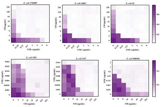 Checkerboard analysis of the synergistic antimicrobial effect of colistin and CH on both colistin-resistant and non-colistin-resistant E. coli. E. coli 1704087, E. coli 16867, and E. coli 42 were mcr-1-positive strains. E. coli 1351, E. coli 1347, and E. coli 1808106 were mcr-1 negative strains.