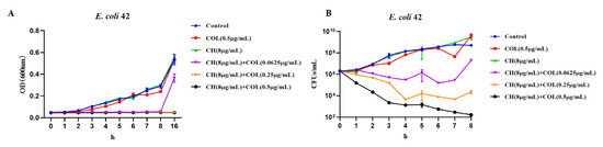 Antibacterial effect of CH combined with colistin against mcr-1-positive E. coli 42. (A) Growth curve assay of E. coli 42; (B) Time-kill assay of E. coli 42. Data were mean ± SEM for n = 3 biologically independent experiments.