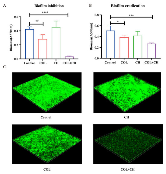 Effects of CH combined with colistin on the biofilm of mcr-1-positive E. coli 42. (A) Inhibition of biofilm formation assay. Colistin (2 μg/mL) or CH (8 μg/mL) alone, CH (8 μg/mL) combined with colistin (2 μg/mL); (B) Eradication of biofilm assay. Data were mean ± SEM for n = 5 biologically independent experiments. * p < 0.05, ** p < 0.01, *** p < 0.001, **** p < 0.0001 vs. control; (C) Staining of bacterial mature biofilm by SYTO 9 (5 μM).