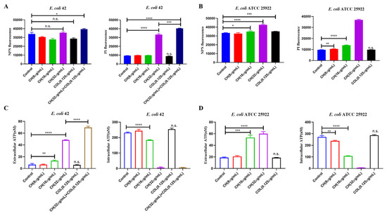 The combination of CH and colistin disrupted bacterial membrane integrity. NPN or PI fluorescence intensity detection after treatment of E. coli 42 (A) or E. coli ATCC 25922 (B) with drugs; The measurement of extracellular and intracellular ATP after treatment of E. coli 42 (C) or E. coli ATCC 25922 (D) with drugs. Data were mean ± SEM for n = 3 biologically independent experiments. n.s. represents no significance, * p < 0.05, ** p < 0.01, *** p < 0.001, **** p < 0.0001 vs. control.