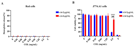 Toxic effects of CH combined with colistin on red blood cells (A) or J774.A1 macrophage cells (B). Data were mean ± SEM for n = 3 biologically independent experiments. **** p < 0.0001.