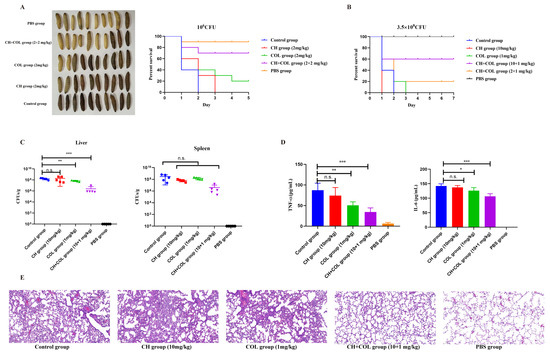 The experimental procedures refer to the previous reference with minor modifications [48]. To evaluate the therapeutic efficacy of colistin and CH in an animal model of bacterial infection, female SPF-grade BALB/c mice were purchased from Huazhong Agricultural University. Six or eight-week-old female BALB/c mice weighing 16 ± 2 g (n = 10 per group) were randomly divided into six groups. The mice were infected intraperitoneally with 3.5 × 10⁸ CFU of E. coli 42 suspension. One hour post-infection, colistin, CH, or the combination group was administered via gavage, and each mouse was administered 100 uL of drug solution, and ddH2O buffer was used as solvent control. Survival was recorded over 7 days. For the non-lethal mouse model, six or eight-week-old female BALB/c mice weighing 16 ± 2 g (n = 5 per group) were randomly divided into five groups and infected intraperitoneally with 1 × 10⁸ CFU of E. coli 42 suspension. The treatment procedure was the same as above. Twelve hours after treatment, mice were anesthetized, and cardiac blood was collected to measure serum levels of IL-6 and TNF-α. The liver and spleen were homogenized and serially diluted, then plated on LA plates. The samples were incubated at 37 °C overnight, and bacterial counts were performed. Portions of lung tissue were fixed in 4% paraformaldehyde for pathological analysis.